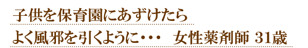 春から子供を保育園にあずけ職場復帰しましたが子供が病気をうつされ呼び戻されることがちょくちょくあり、仕事をやめました。両立できる職場を探していましたが自身では見つからず登録しました