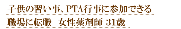 子供が小学生になると昼2時過ぎには家に戻ること、PTA行事や習い事で平日が忙しくなったので転職。パートで週3日で急な対応ができる薬局さんの紹介をお願いしました。