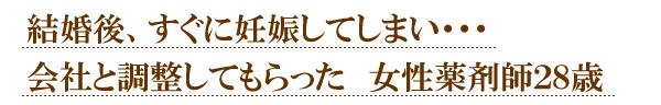結婚で転職をしましたがすぐに妊娠してしまい担当コンサルタントに相談をしてみたところコンサルタントさんの方から上手に連絡していただき辞めずにすみました。転職したばかりでまた転職は大変だし妊娠しながらの転職は辛いので本当に助かりました。自分ではなかなか切り出せないので生まれてくる子供のためにも良い環境ができそうです。